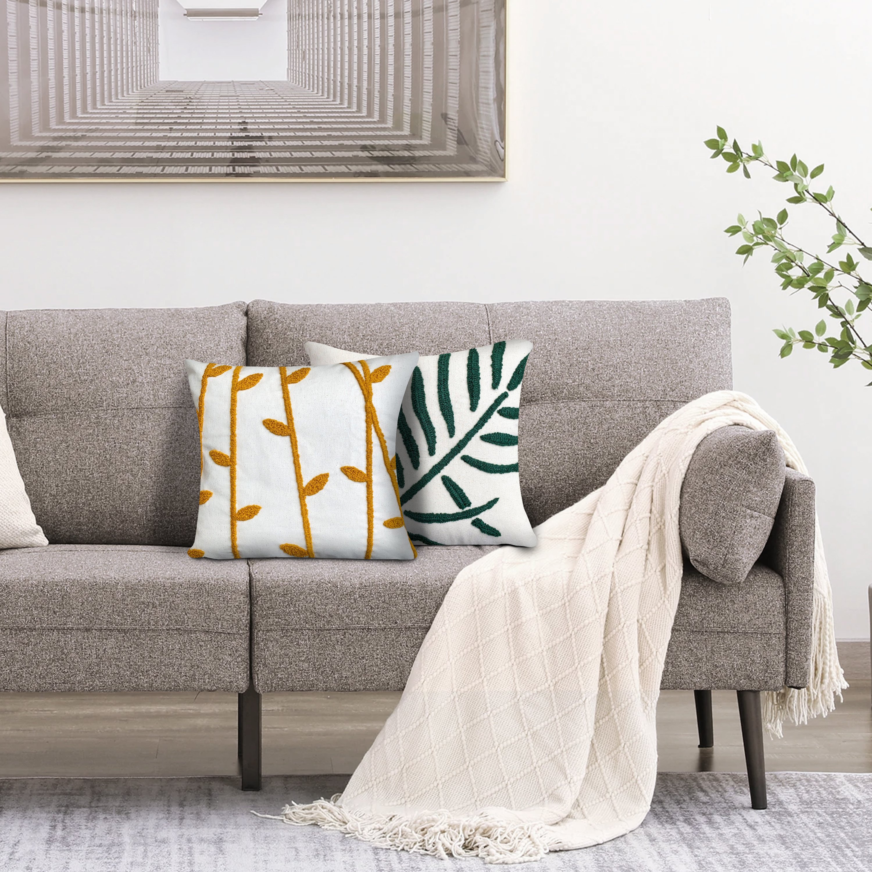 17 x 17 Inch 2 Piece Square Cotton Accent Throw Pillow Set, Leaf Embroidery, White, Green, Yellow