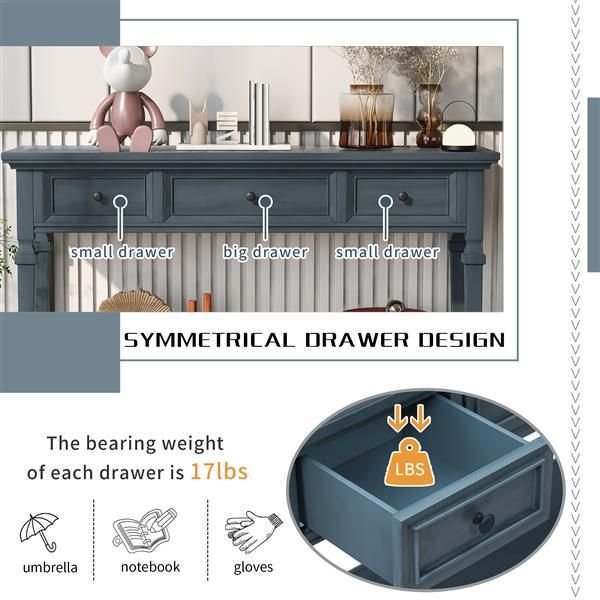 20" CARRY-ON/ 24" 28" CHECKED LUGGAGESize:20" 13.8 x 8.3 x 21.5"24" 16.2 x 10.2 x 25.1"28" 18.5 x 11.6 x 29.5"Sets can be stored inside each other.The carry-on size dimensions will meet most airline approved.HOW DO I RESET THE COMBINATION LOCK1. The lock is set to 0-0-0 at the factory.2. Locate the reset button adjacent to the dials, push it and hold while you rotate the dials to your desired 3-digit code.3. Release the reset button and your code is now set.4. Scramble the dials and test your new code to be sure the correct one is set.With simple and crisp lines and concave and convex feel, this American retro style console table equipped both classicism beautiful shape and neoclassicism function. It's concise, solemn and comfortable. The conical table legs in the shape of four square columns have a strong sense of design and sober temperament. Match with vintage metal handles, this console table of modelling restoring ancient ways has history feeling while beautiful and practical.Not only does this console table look rigorous and steady, but the actual using experience is consistent with the appearance temperament. Frame and legs of this console table are made of solid pine wood and MDF board, and the spray paint surface is glossy, tactile and smooth. Firm wood structure is good to ensure the use of long-term and stability.This console table incorporates a balanced aesthetic to present a symmetrical structure, and the most direct reflection is the design of the three top drawers. A big drawer in the middle and two small drawers on both sides. The consistent expression of the modelling that drawer surface concave and convex is integral style. Three matte metal retro handlebars make the better using experience. Exquisite and attentive design revealed from these details.The part of the drawers is of limited height, the overall design of this console table is compact. The bottom shelf got large space to accommodate plenty of daily supplies. The load-bearing capacity of the bottom shelf is 66 lbs, and the amount can bear most things in your daily life. The bearing weight of each drawer is 17 lbs, and suitable for files or books, or some tools. Flat tabletop is a perfect place to support decorations and lamps, the load-bearing capacity of tabletop is up to 22 lbsAfter realizing the functional and aesthetic merits of this console table, there's one more surprise for you here, the installation steps for this console table are so simple that you only need to link the legs and bottom board together after taking the parts out of the package. It is as simple. You can enjoy the charm of this console table. Dimension of this product is 5 "L x 15"W x 3 "H.