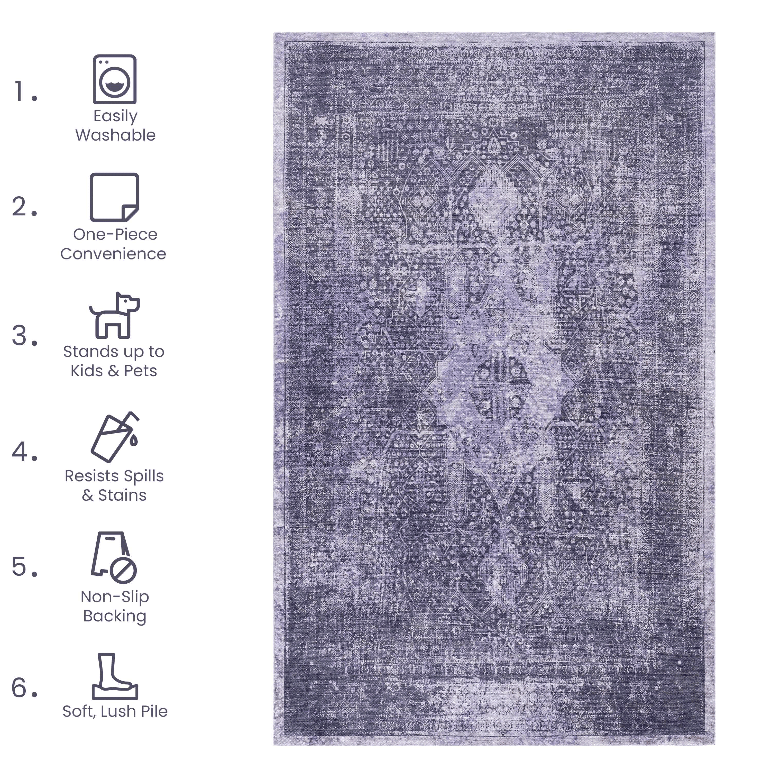 Looking for the perfect machine washable area rug that blends elegance and functionality? Look no further than our versatile area rugs, meticulously crafted to harmonize with every corner of your home. With its low-pile construction, effortlessly complements various indoor settings. Its special features, including machine washability, non-slip backing, and stain resistance, make it an ideal choice for high-traffic areas like the living room, dining room, bedroom, hallway, kitchen, or playroom.